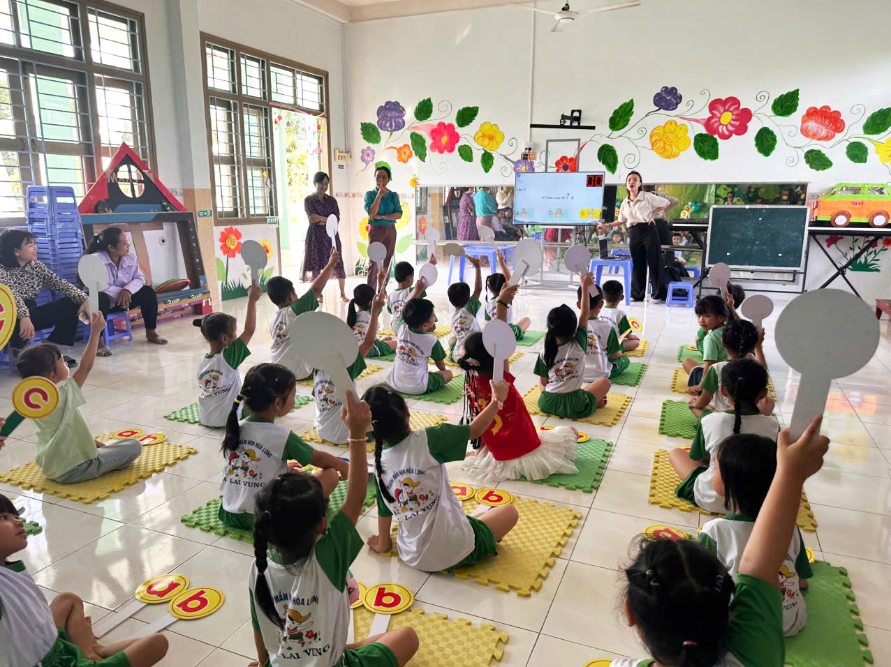 Chương trình được triển khai trong không gian lớp học quen thuộc tại điểm Long Hội, với cách bố trí khoa học và hợp lý. Mỗi bé có vị trí riêng cùng bảng trả lời cá nhân, giúp các em chủ động tham gia và tập trung trong suốt quá trình thi. Không gian thân thiện, gần gũi góp phần tạo điều kiện thuận lợi để trẻ phát huy tốt khả năng.