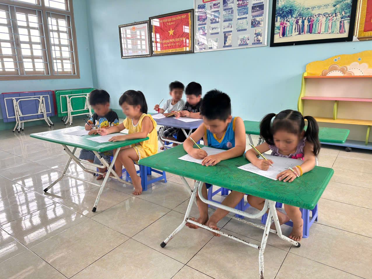 Chương trình được triển khai trong không gian lớp học quen thuộc, với cách bố trí khoa học và hợp lý. Mỗi bé có vị trí riêng cùng bảng trả lời cá nhân, giúp các em chủ động tham gia và tập trung trong suốt quá trình thi. Không gian sinh động, gần gũi góp phần tạo cảm giác thoải mái, giúp trẻ phát huy tốt khả năng của mình.