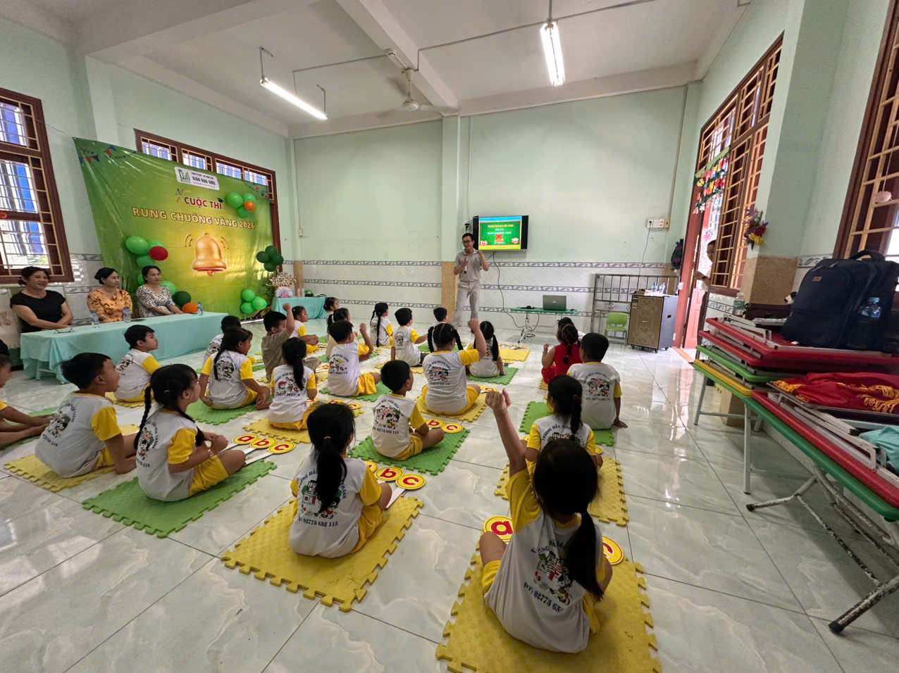 Chương trình được tổ chức trong không gian lớp học quen thuộc, với cách bố trí khoa học, đảm bảo mỗi bé có vị trí riêng và bảng trả lời cá nhân. Điều này giúp các bé tham gia một cách chủ động, tự tin và tập trung trong suốt quá trình thi. Không gian trang trí sinh động cũng góp phần tạo nên sự hứng thú cho trẻ.